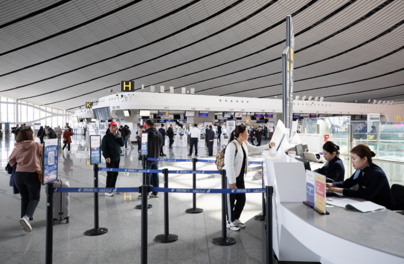 旅客在大兴机场航站楼四层航司服务柜台办理手续。作者:大兴机场 杨函泽