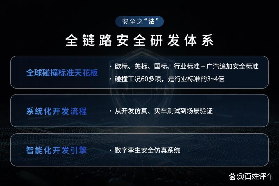 广汽全链路安全研发体系包含行业天花板级的碰撞安全标准,从开发仿真、实车测试到场景验证的系统化开发流程,以及数字孪生安全仿真系统等智能化开发引擎。其中,广汽的碰撞标准在欧标、美标、国标及行业内所有最高标准的基础上,细化追加了更严格的要求,工况高达60多种,是行业标准工况数量的3-4倍。