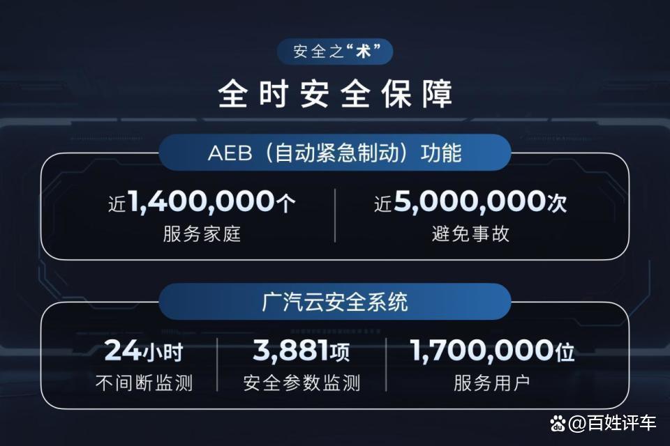 此外,广汽提供了主被动融合安全技术保障。广汽搭载的全栈融合感知系统和主动安全技术,在碰撞前通过雷达和摄像头提前识别风险,在 700毫秒内实现躺姿座椅回位,同步启动坐垫气囊、预紧安全带,全方位保护乘员安全。而广汽首创的安全气囊融合点爆技术可以实现不同碰撞强度下的精准点爆,配合国内车企中首创的后风窗气囊和二排正面气囊,真正实现720度无死角守护。此外,广汽笼式盾甲车身结构、一体式热成型双门环抗撞结构、六边形蜂窝状多胞吸能结构等设计,共同为用户构建了坚固的安全防线。