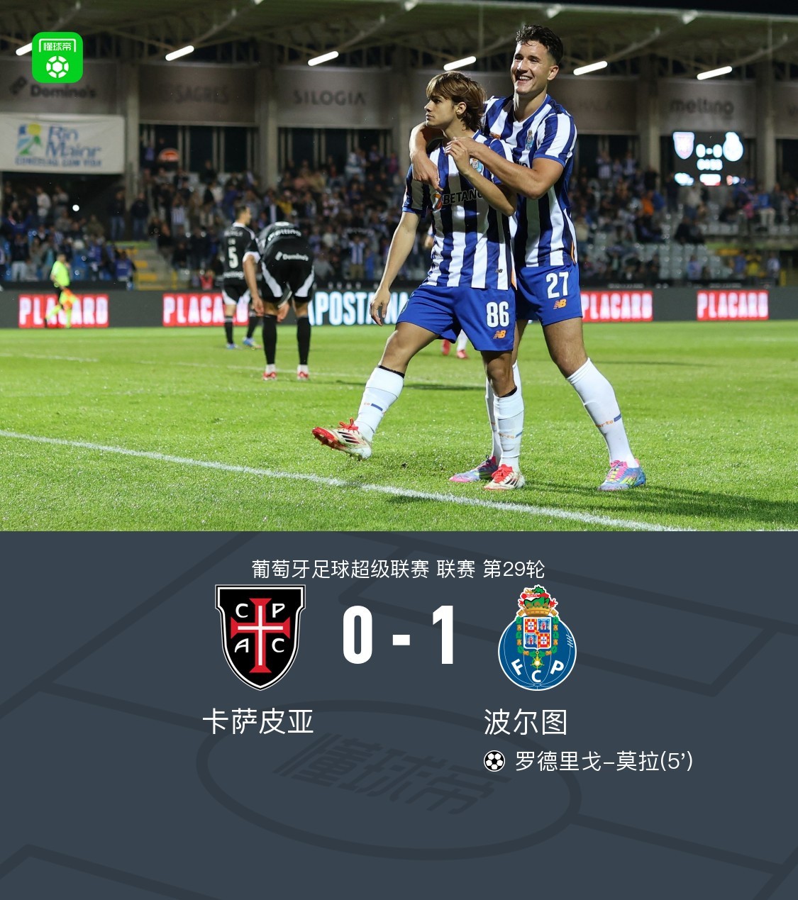 北京时间4月13日,葡萄牙足球超级联赛第29轮,卡萨皮亚主场迎战波尔图。比赛中,罗德里戈-莫拉成功取得进球,为波尔图奠定胜局。最终,卡萨皮亚0-1不敌波尔图。