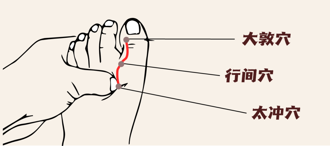 在太冲前约两横指处,善清肝胆郁热。以拇指甲尖掐按,酸感直透趾缝,每次5秒,间隔5秒,重复20次,如清风拂面,可熄胸中无名之火。