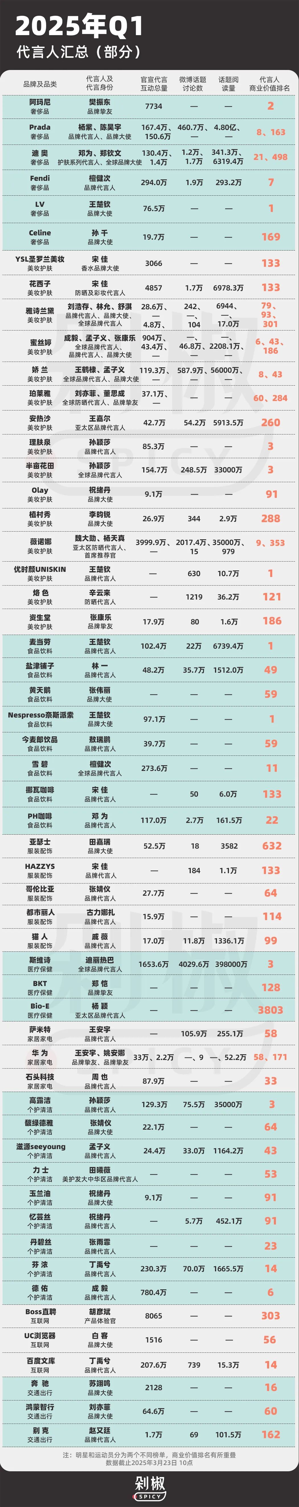 第一季度,孟子义以 10 个代言领跑,覆盖娇兰、膜法世家、蜜丝婷等品牌,成为 “妆护一体” 的高频曝光符号;祝绪丹 3 月连宣 7 个代言,从 urban decay 到蕉下,将个人风格与品牌调性深度绑定;李昀锐也高频官宣 7 个代言,植村秀到宝格丽、路虎,实现 “美妆 + 高端品牌” 的渗透;“质感派” 代表宋佳也加入战局,将诺瓦咖啡、圣罗兰、花西子等品牌收入囊中。