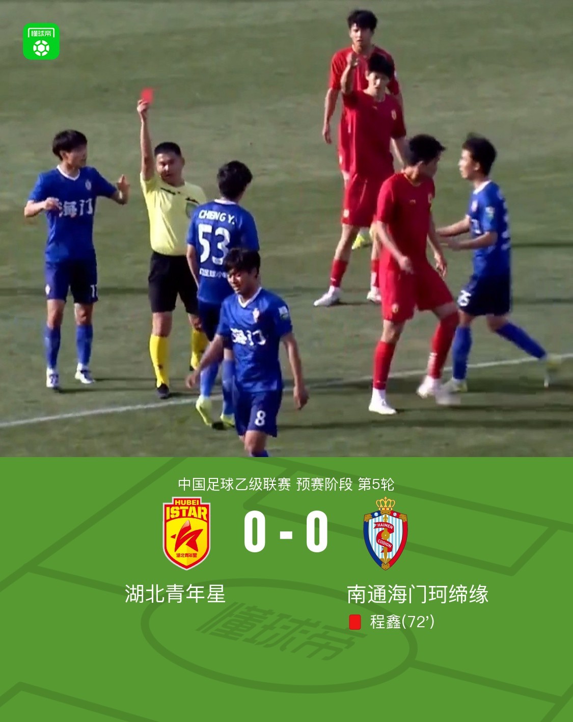 北京时间4月13日中国足球乙级联赛 预赛阶段 第5轮,湖北青年星主场对阵南通海门珂缔缘。最终比分湖北青年星 0-0 海门珂缔缘。