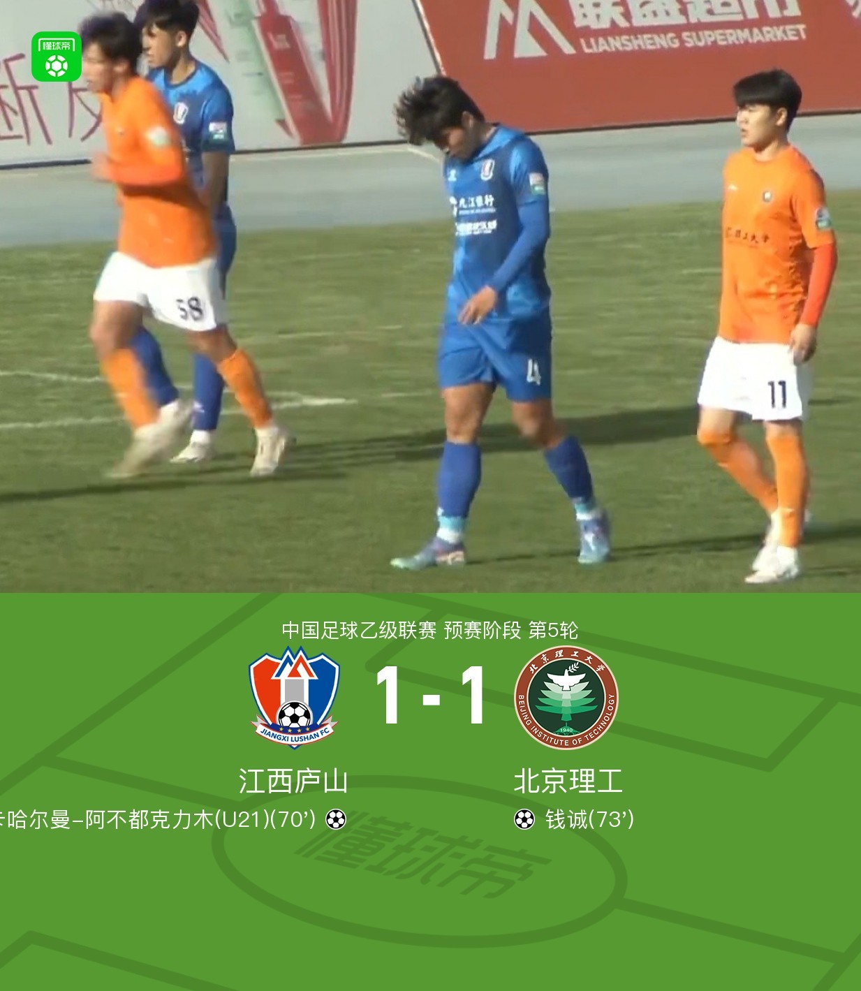 北京时间4月13日,中国足球乙级联赛预赛阶段第5轮,江西庐山主场迎战北京理工。比赛中,江西庐山由卡哈尔曼-阿不都克力木打入一球取得领先,随后北京理工凭借钱诚的进球扳平比分。最终,双方以1-1的比分握手言和。