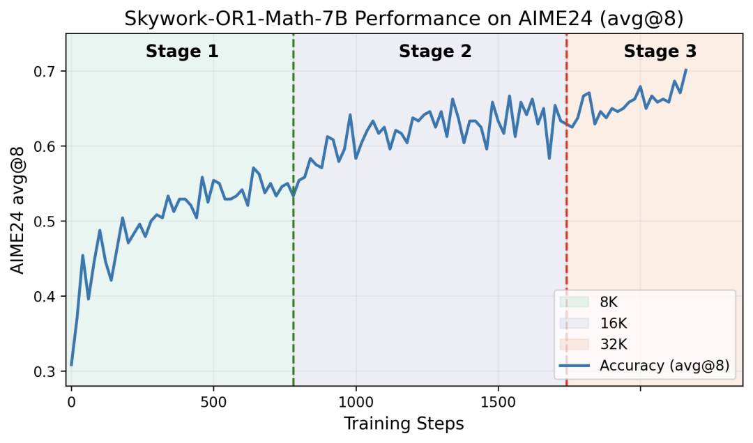 在此训练策略下,Skywork-OR1-7B和Skywork-OR1-32B-Preview通用推理模型仍处于持续提升状态,本次开源是当前训练过程中性能最佳的checkpoint。