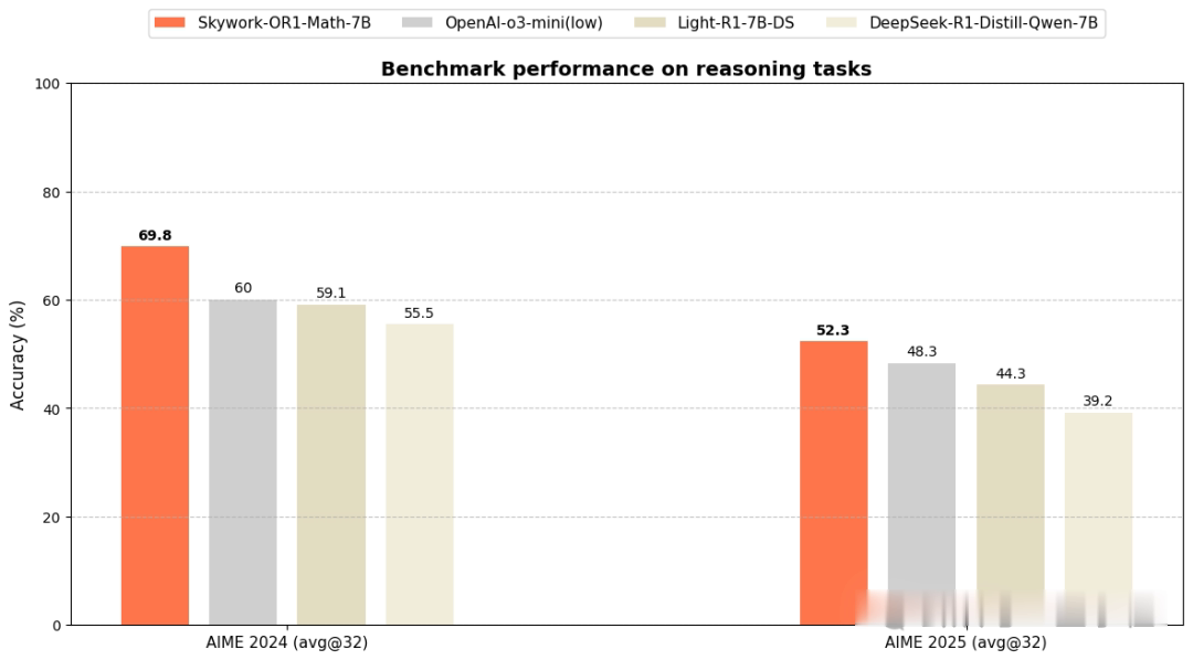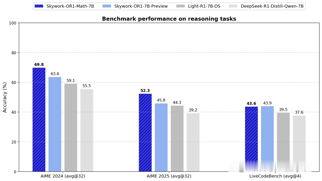 数学推理方面:7B、32B都达到同规模最优,数学专项模型(Skywork-OR1-Math-7B)表现更突出。