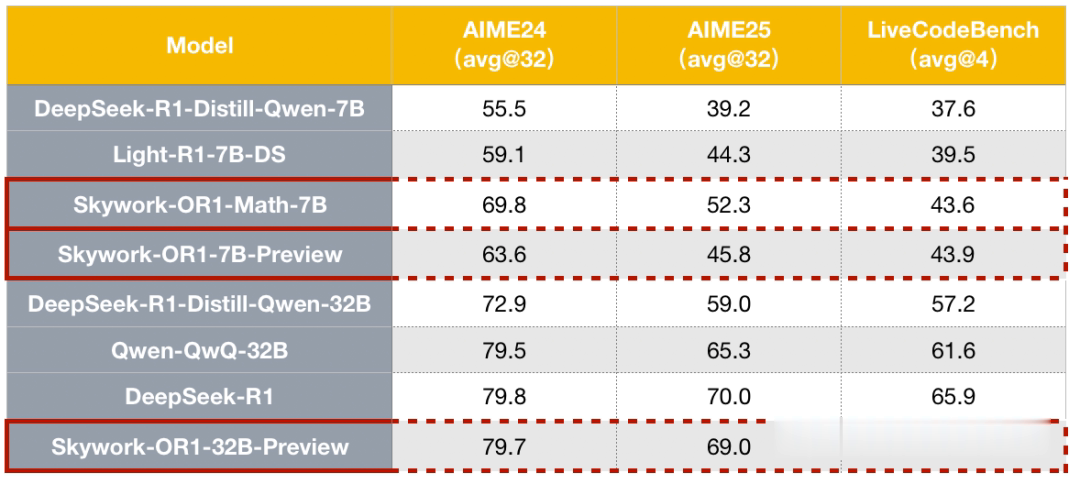 团队对比了Skywork-OR1系列在AIME24、AIME25、LiveCodeBench上的表现。