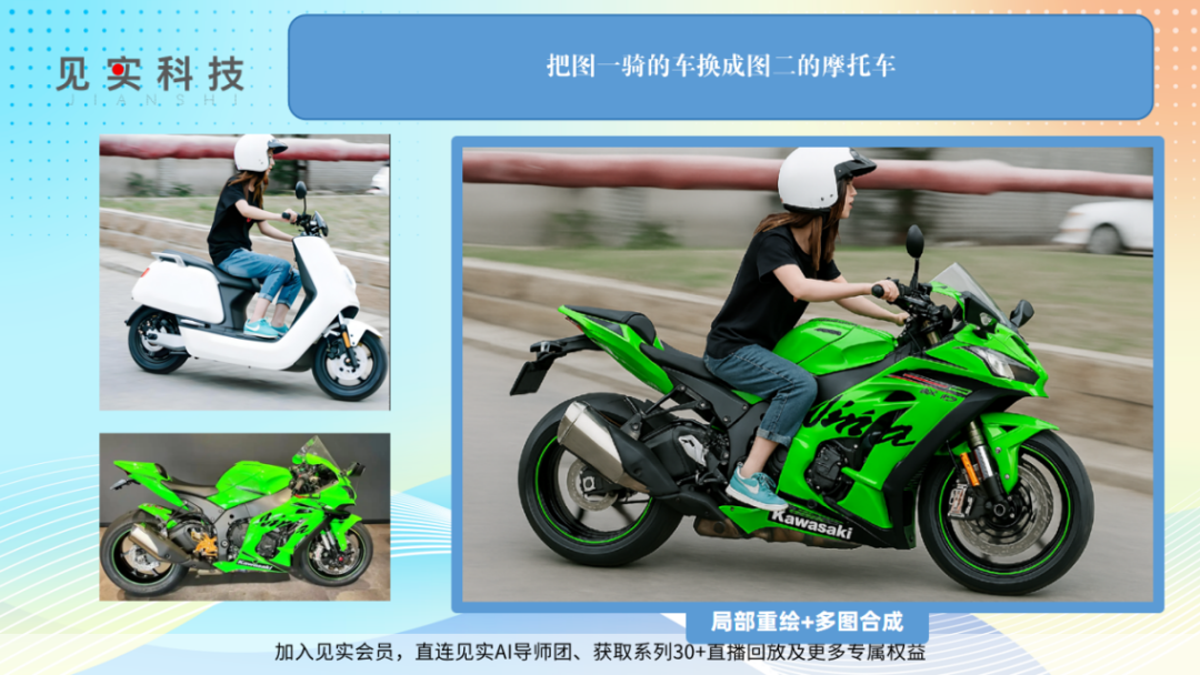 我们上传两张图,第一张是骑着白色摩托车的,第二张是绿色摩托车。我们用自然语言告诉GPT-4o:“把图一骑的车换成图二的摩托车”。我们可以看到生成的结果,比如耐克的鞋子得到了保留,车的花纹(黑色花纹)也得到了保留,车子最下方的英文“Kawasaki”也得到了保留。