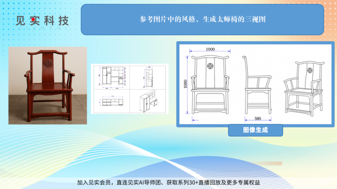 那反向操作可不可以?假设我们现在有一把椅子,告诉GPT-4o“参考图片中的风格,生成太师椅的三视图”,它也是可以直接出来的。所以说,现在假设你在做一些家居方向的产品,用GPT-4o的话,基本上对工作的提效程度是很高的。