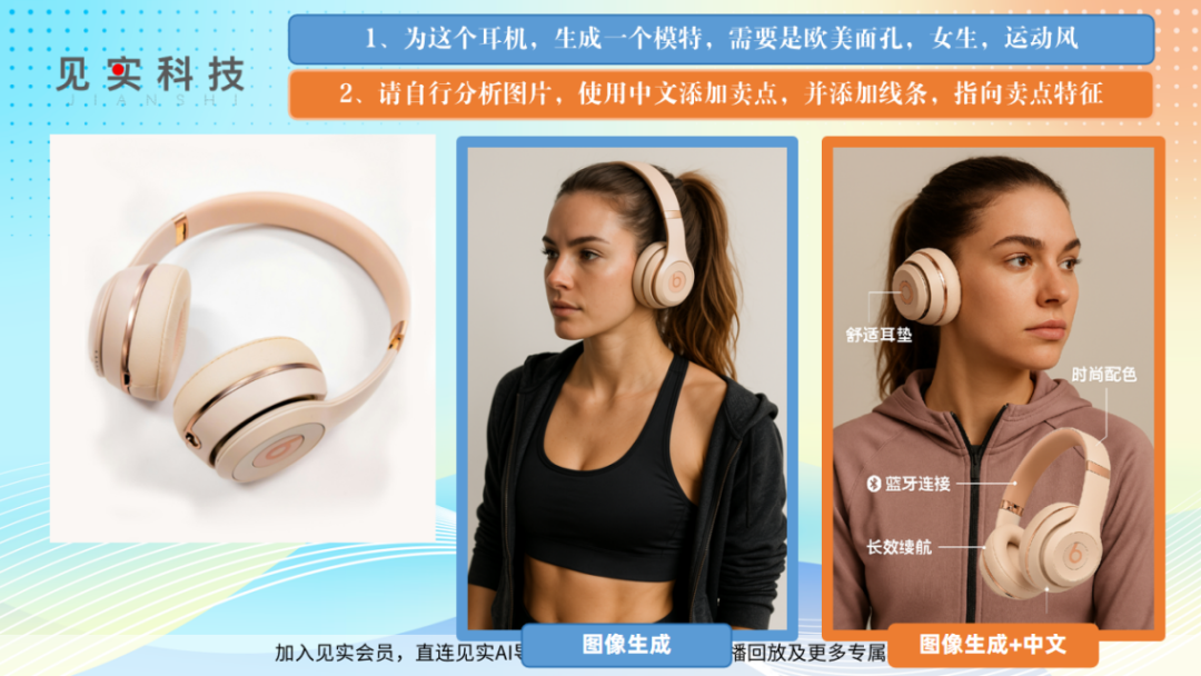 可以看到这里有个耳机,我们先用这个耳机生成一个欧美面孔的女生,运动风的模特,它直接就能生成。从这个案例可以看出,它对整体产品的识别相对还是可以的。