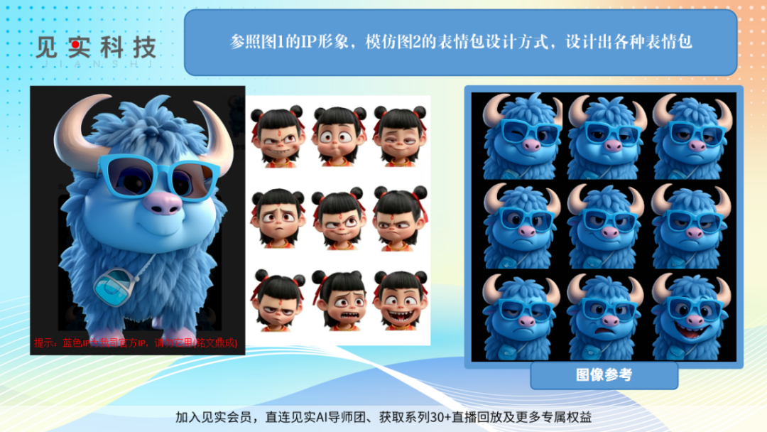 再比如做表情包。下图左边是我们公司的卡通IP形象,我们想让它模仿哪吒的表情做一批表情包。以前这得请专业设计师来定制,费时又费力。现在用GPT-4o,基本可以一键搞定。右侧生成的表情包和中间的原图效果几乎一致。