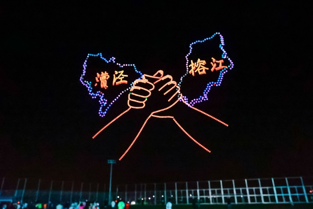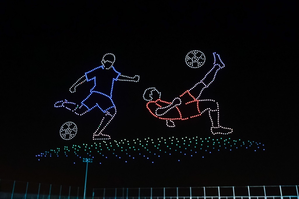 千架无人机点亮夜空,巧妙融合足球精神与乡土文化,以天为幕、以光为笔,在夜空中勾勒出“榕入申城 漕劲村超”“漕泾郊野公园”等绚烂的动态光影,引得观众连呼“震撼”。