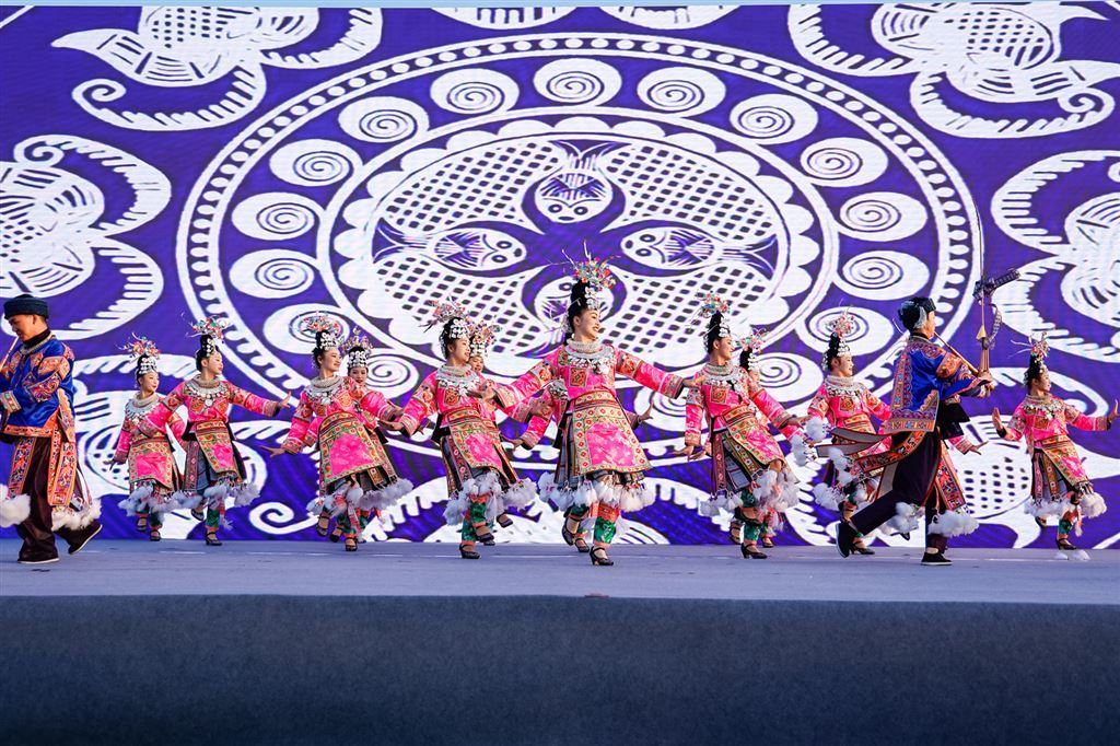 值得一提的是,开幕式上的文艺展演生动构建起民族文化与海派江南文化对话交融的立体图景。身着五彩服饰的侗族歌舞团队以多声部大歌与漕泾阿卡贝拉人声乐团形成跨时空共鸣;金山非遗农民画衍生的主题舞蹈、民俗表演舞龙滚灯,与苗族踩歌堂的原始律动轮番上演,在舞台上完成了一场跨越千里的美学共振,诠释了“山海相连、文化共美”的深厚情谊。
