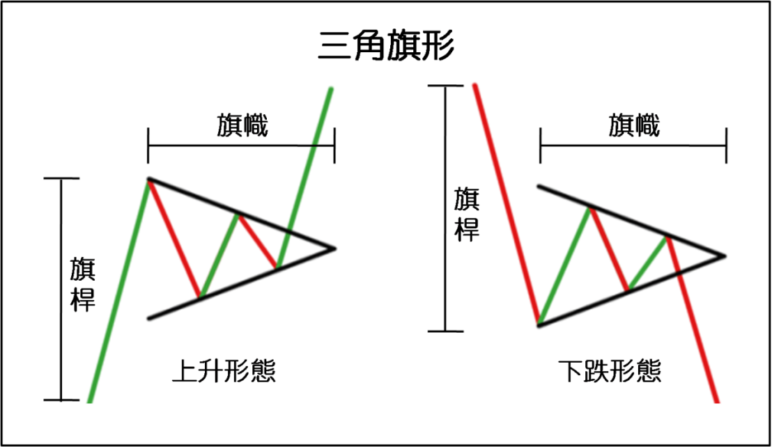「三角旗形」和「对称三角形」的另一差别在维持时间上,前者较多见于股指或个股出现急升或急跌后。买方 (卖方) 动力忽然发力,卖方 (买方) 动力未及应对,股指或个股就见急升 (急跌),随后卖方 (买方) 必须作出回应,于是买卖双方拉锯进入整固期;但从整固期间股指或个股渐见收窄,便知激烈争持维时不久,逐渐归向平静,反映卖方 (买方) 反击力度不足,所以当交投忽然「放量」时,往往是买方 (卖方) 又再发力,一举摆脱整固期,并延续整固前走势。