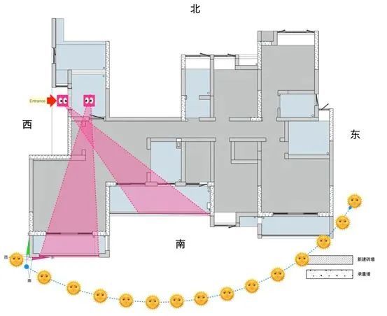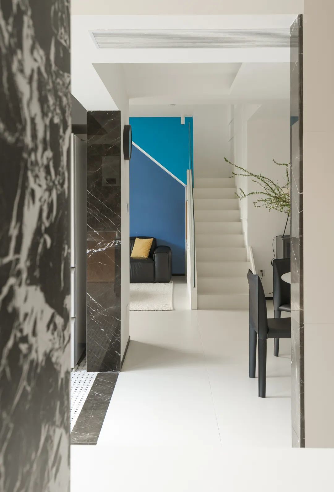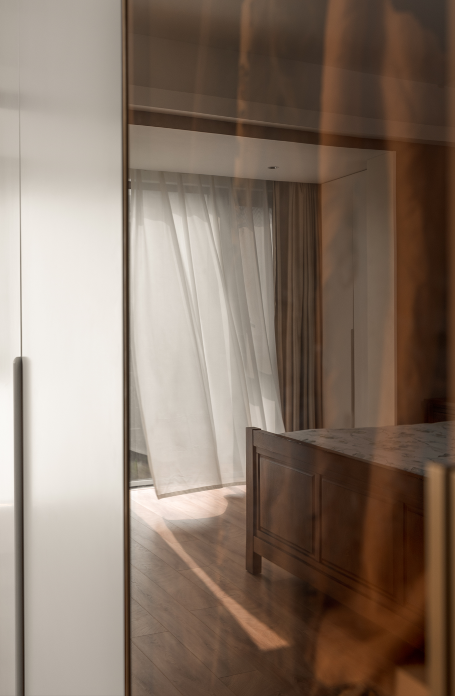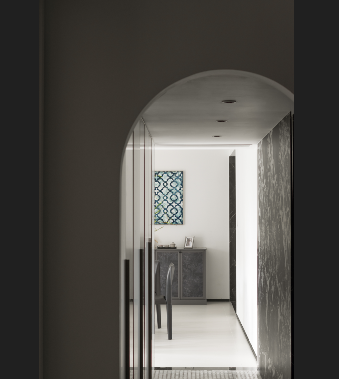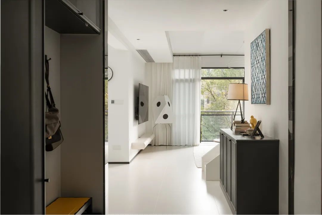 原本正对阳台的门厅,采光条件尚可,不过设计师并不局限于单线满足,通过户型的优化,进一步改善公共区域的视角和采光条件。
