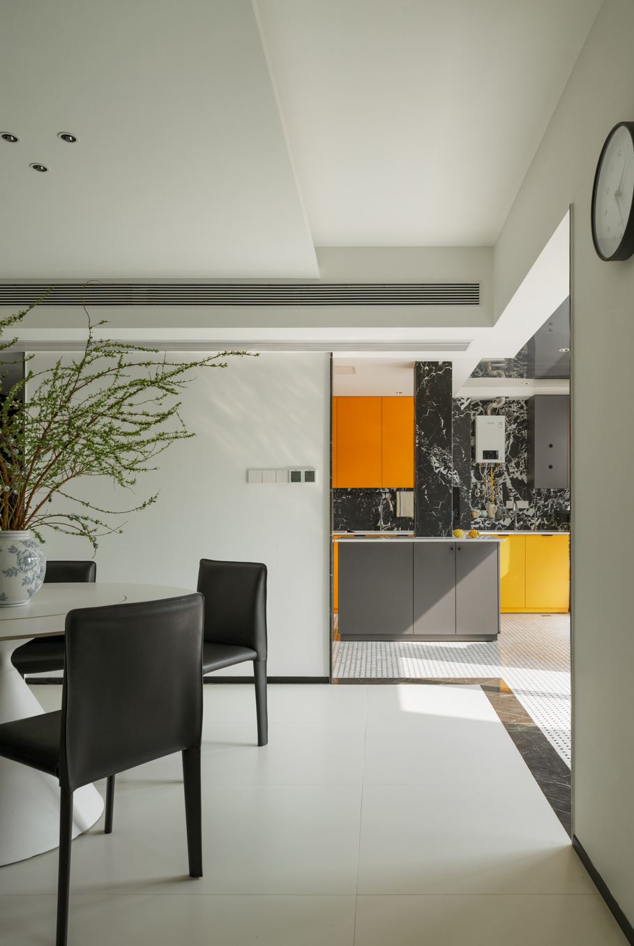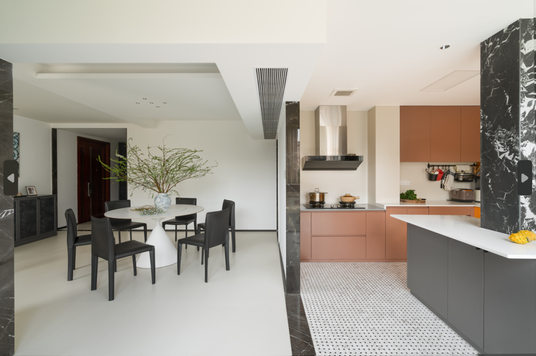 打通了部分墙体之后,餐厨区域畅通一体,餐厅和厨房之间以深色石材做了钩边。设计师介绍说,这样的方式客厅不会散掉,还会自动脑补厨房与餐厅的承接关系。