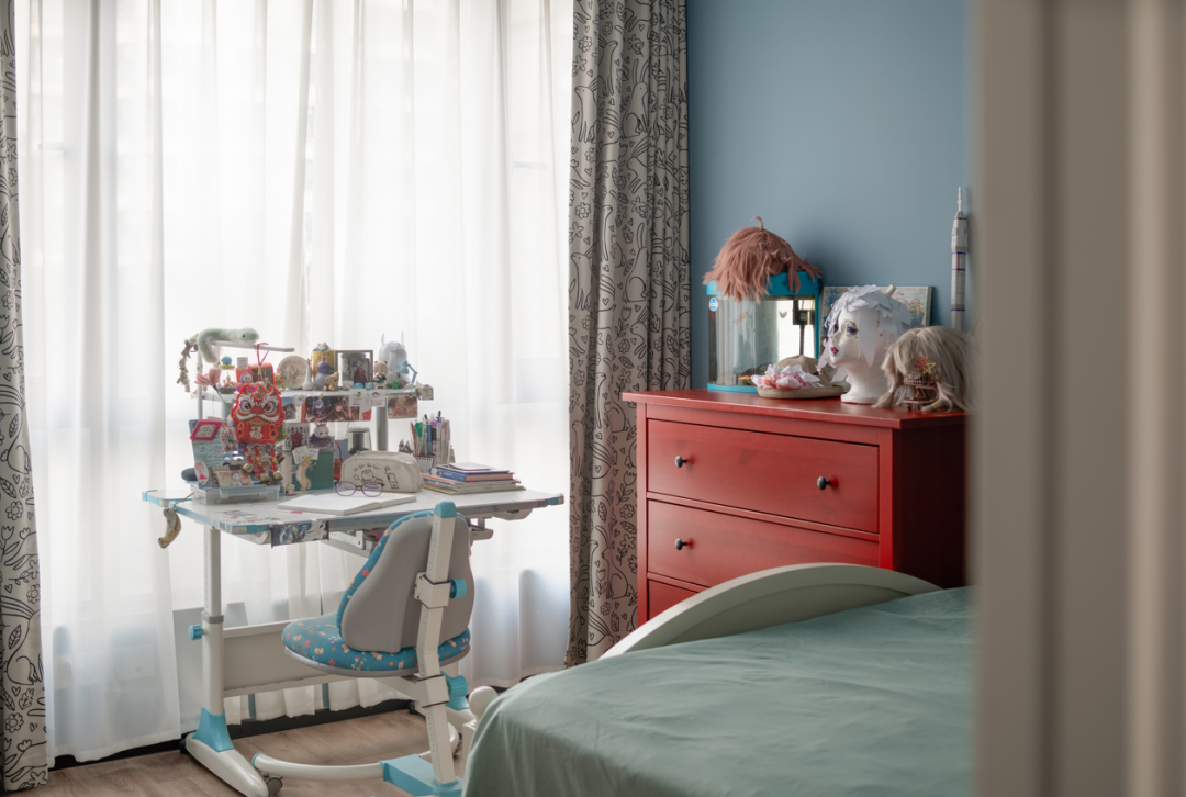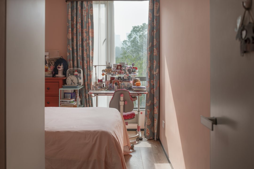 性格开朗、大条的小女儿,不缺力量,缺制控,朝北的卧室可以让她的状态快速冷静下来。这样的房间分配,是设计师对人、对环境细微感知的结论,与风水大师的建议不谋而合。
