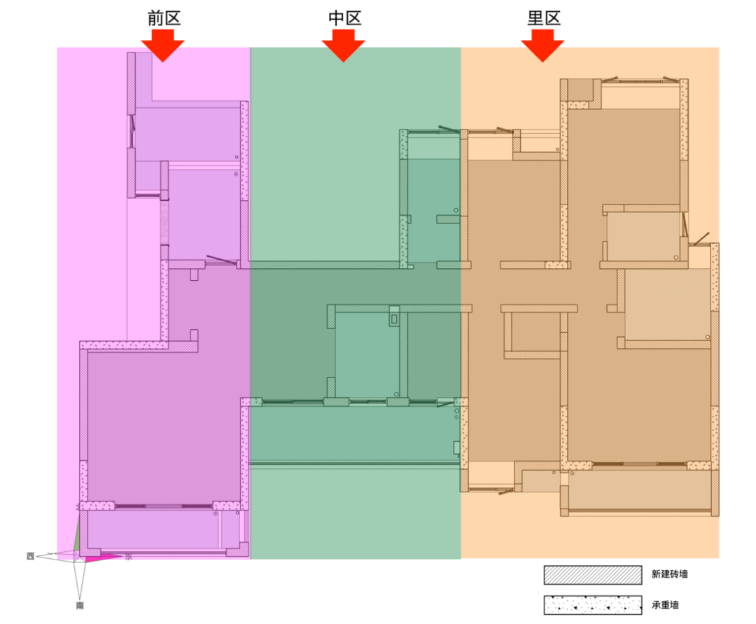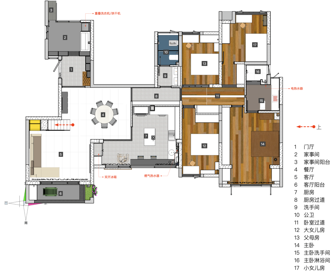 设计师借助充分且丰富的感知,为这个三代同堂的家庭进行了房屋格局的重组,结合一家人的当下的生活状态,顺势而为把空间分为前、中、里三个部分,分别对应交流区、功能区和私区,合理的分区和流畅的动线让一家6口真正享受到了大平层对于生活的改变。