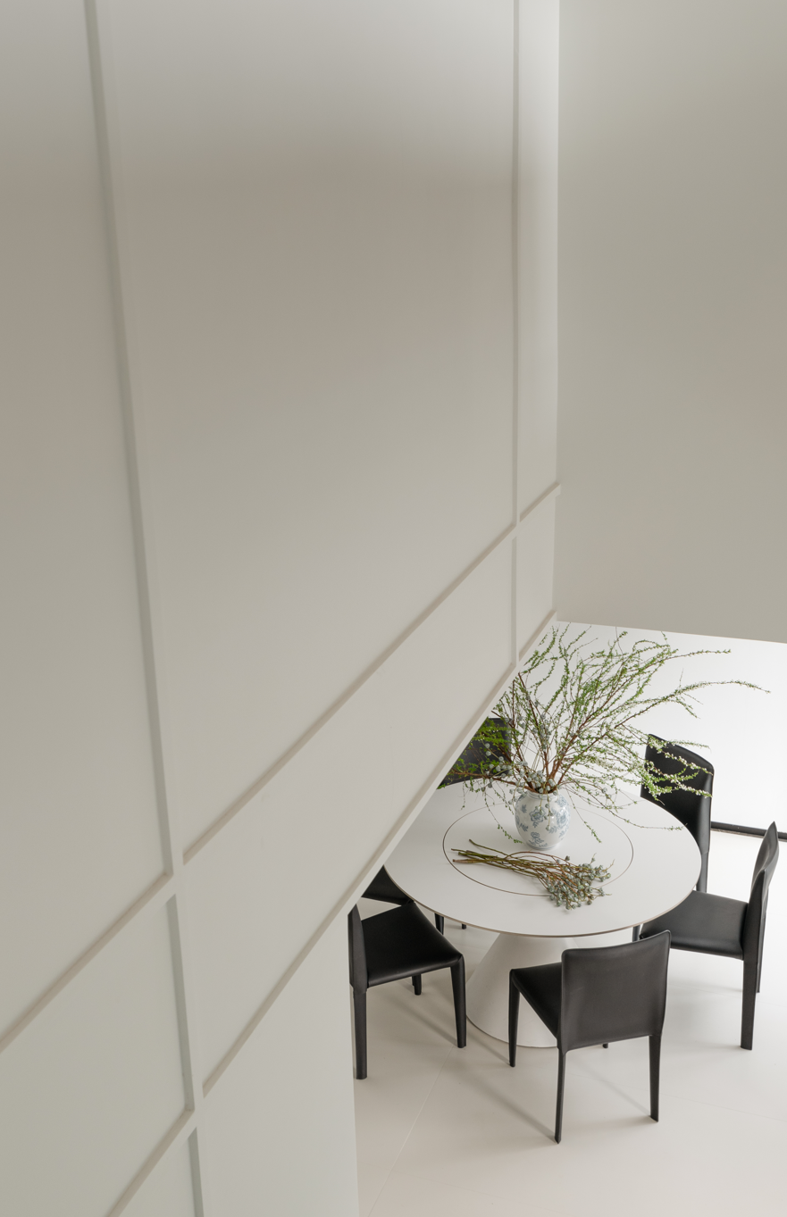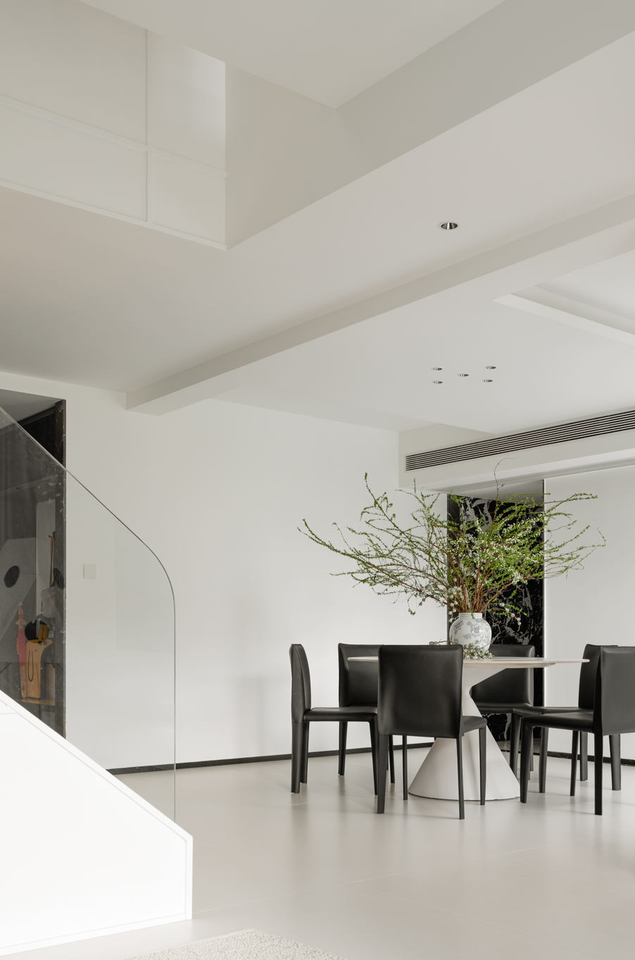 餐厅区域紧邻客厅,延续着客厅极简的设计语言,围坐在圆桌上用餐,在面对面互动和交流的过程中,一家人的情感也在日复一日慢慢生长、发酵、升华。