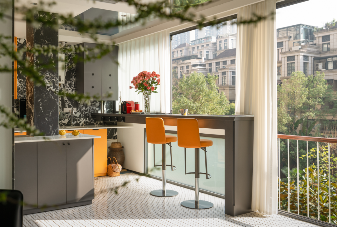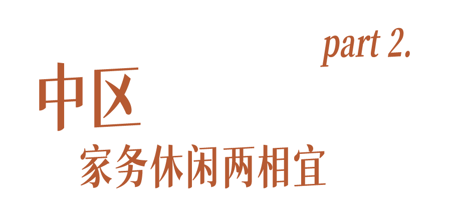 中区将餐厨、卫生间容纳其中,还不乏靠窗吧台等亮点,维系着一家人生活的流畅运转。
