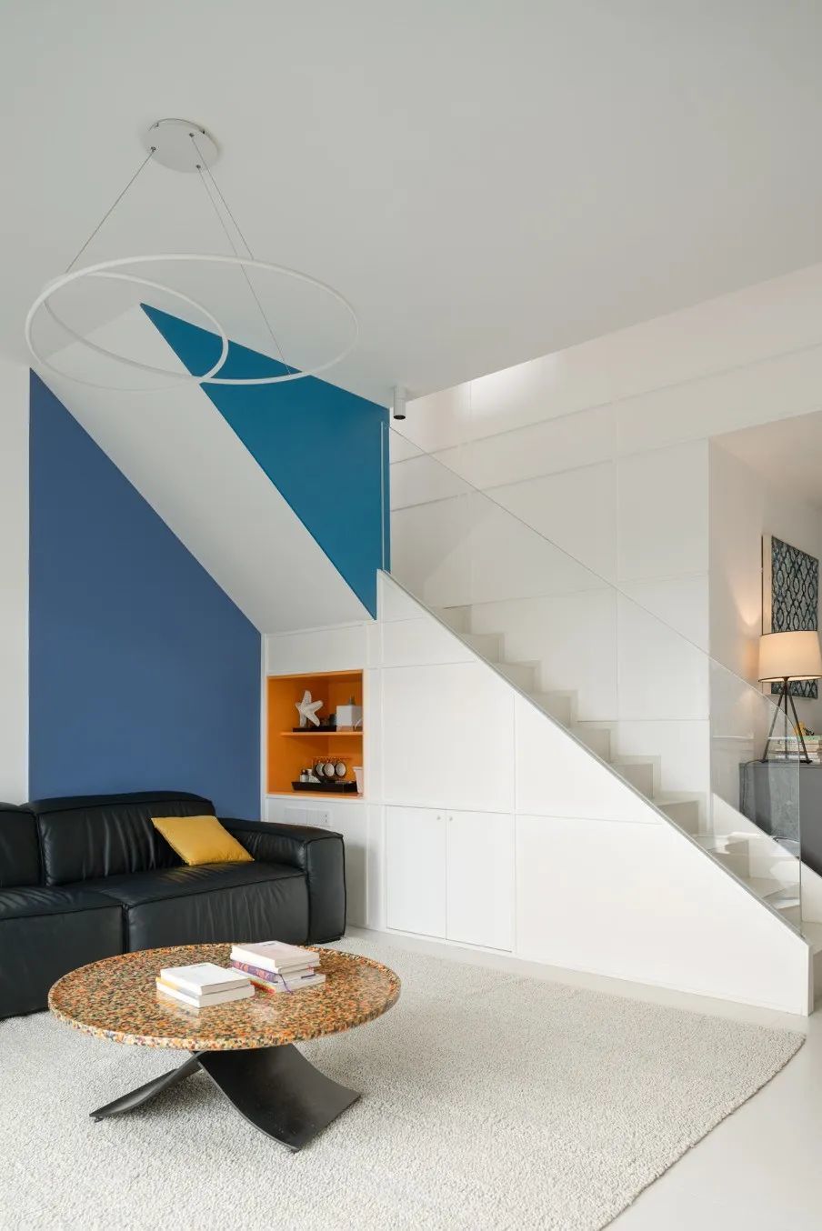 楼梯下方增加储藏空间,开放格起到客厅边几的作用,白色柜门实现了无感收纳。