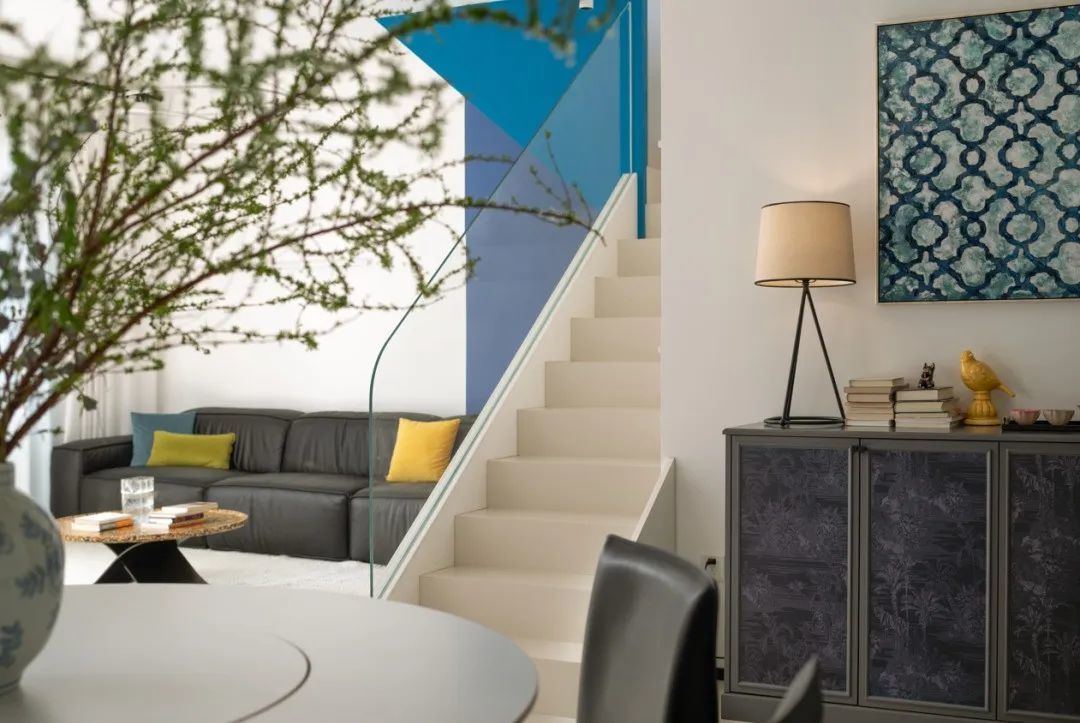 独立的客厅与楼梯形成功能的穿插,极简而自然的设计语言,深色的复古收纳柜与黑色的沙发,为这个明亮的空间注入沉稳的气息。
