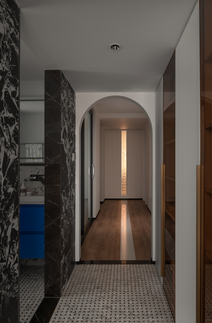 厨房地面的马赛克一直延续到北侧的洗手间,与里区不同的地面材质,消解了走廊冗长的纵深感,并引导家人左转进入卫生间。