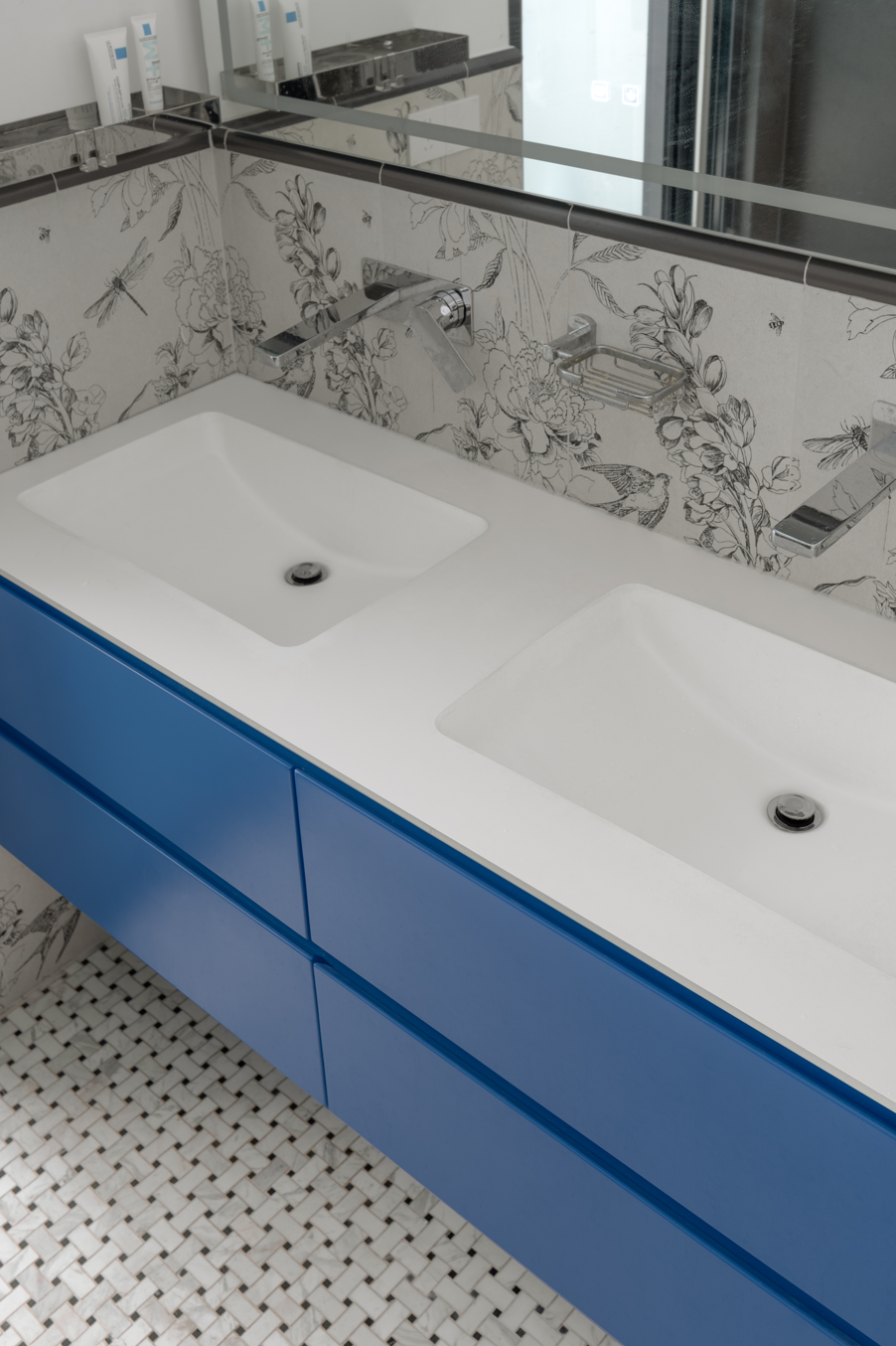 洗手间蓝色的柜门和客厅的蓝色元素形成呼应,墙面瓷砖古朴典雅的花样纹理,符合屋主时尚大方的个性,赋予空间独特的质感。