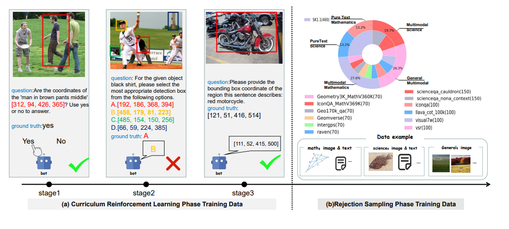 图 3. 训练数据组织架构图。 (a) 课程强化学习的三阶段渐进式响应格式示例。展示了任务从简单到困难的递进过程,呈现不同阶段的响应格式变化。 (b) 拒绝采样 SFT 阶段使用的数据来源分布。