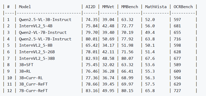 为了验证 Curr-ReFT 的泛化性以及使用后不会削弱模型在其他领域的推理能力,我们在多模态领域多个 Benchmark 数据集上进行验证。Benchmarks 上不同方法模型的测试结果如下(评测集裁判模型使用 GPT-3.5):