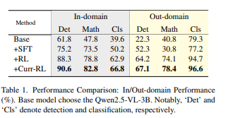 提升推理与泛化能力:实验结果显示,强化学习方法显著提升了 VLM 在分布外数据上的表现。
