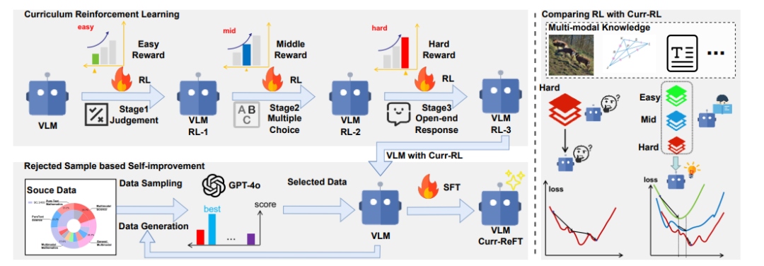 基于这一重要发现,我们提出了创新性的课程式强化学习微调(Curr-ReFT)后训练范式。该方法巧妙地融合了渐进式课程学习与拒绝采样策略。Curr-ReFT 通过两个关键机制: