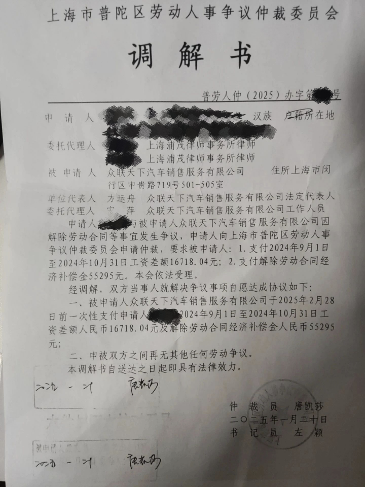 一份由员工提供的上海市普陀区劳动人事争议仲裁委员会调解书显示,被申请人众联天下汽车销售服务有限公司应于2025年2月28日前一次性支付申请人2024年9月1日至2024年10月31日工资差额16718.04元,以及解除劳动合同经济补偿金人民币55295元。