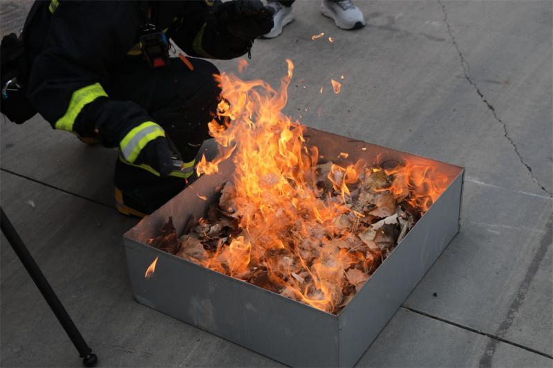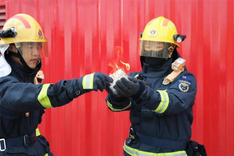 杨柳絮遇到明火会发生什么?实验现场,两名消防员身穿灭火战斗服,手戴防护手套,其中一名消防员手捧一团杨柳絮,另外一名消防员拿打火机点燃杨柳絮。接触明火的瞬间,杨柳絮迅速燃烧蔓延,仅需两秒钟,消防员手中的杨柳絮燃烧殆尽。