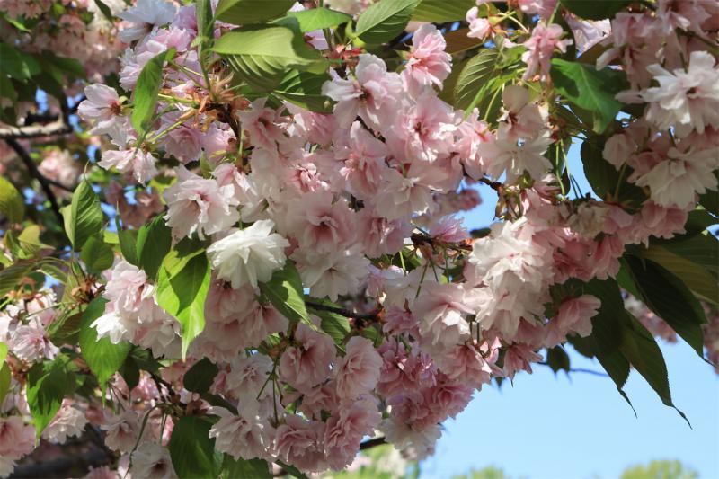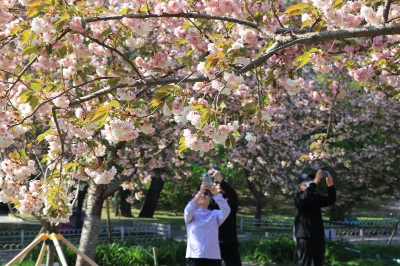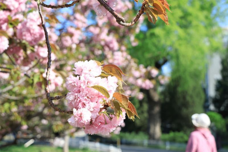 为何晚樱不惧强风?对此,玉渊潭公园高级工程师孙玉红解释说:“首先,晚樱多为重瓣品种,花瓣层数多且质地较厚,抗风雨能力强,不易被外力打落。其次,晚樱一般先叶后花或花叶同放,叶片的光合作用可为花朵持续提供养分,保持花朵生命力旺盛和较高的细胞活性,且公园的晚樱正处于盛花期,花朵与树枝间的连接紧密,能更好地应对大风等外界不利因素。第三,晚樱的授粉需求较低,多数晚樱的不育性较高,无需为结果而快速凋落。人们常看到的樱花雨多为早樱的花瓣,而晚樱到了末期却是整朵掉落。”