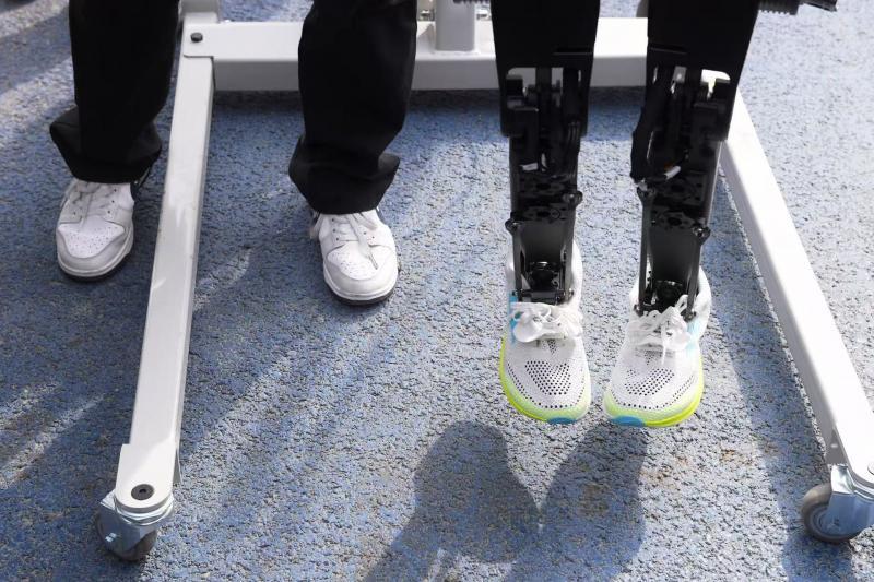 北青报记者注意到,测试现场的N2机器人脚上还穿着一双29码的儿童运动鞋。覃帮羽介绍,在此前的长距离测试中,机器人关节部件磨损比较大。为了解决这个问题,团队成员想到可以像人类一样穿上跑鞋。不过机器人穿鞋可不像人一样那么简单,首先要根据机器人本来的脚大小挑选鞋码,然后鞋底的材质还不能太薄太软,“机器人的脚要用螺丝固定在鞋底上,整双鞋的中心也很重要”。团队成员特地去商场里购买了十几款童鞋一双双测试,然后根据结果给鞋子进行加工,更换螺丝、垫片等。N2机器人穿上鞋子不仅能增加摩擦力,关节磨损也大幅减少。