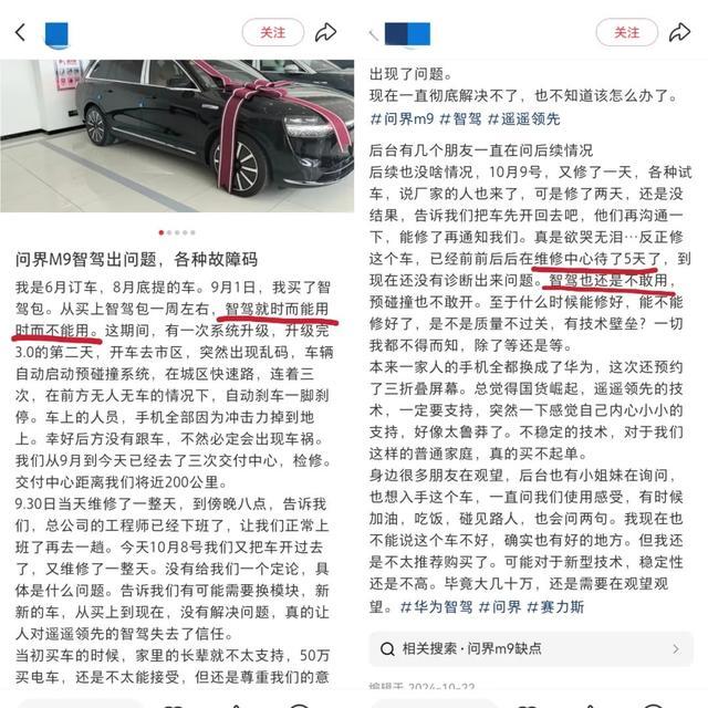 在社交媒体小红书上,一位IP地址显示为新疆的网友,针对问界的智驾安全性分享了自己的经历。该网友透露,其购入问界M9并购买智驾包后,大约一周时间里,智驾功能状态不稳定,时而可以正常使用,时而无法启用。该车前前后后在维修中心维修了5天,直至当前,故障问题仍未被诊断出来。该网友如今既不敢使用智驾功能,连预碰撞功能也不敢开启了。