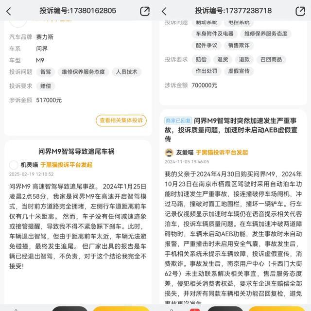 在黑猫投诉平台上,存在着消费者对问界M9 智驾功能的投诉。有消费者反馈“问界M9 智驾导致车辆追尾”。还有消费者投诉“问界M9 在智驾状态下突然加速,接连撞破停车场闸机后冲过马路”,诸如此类的智驾问题屡见不鲜。