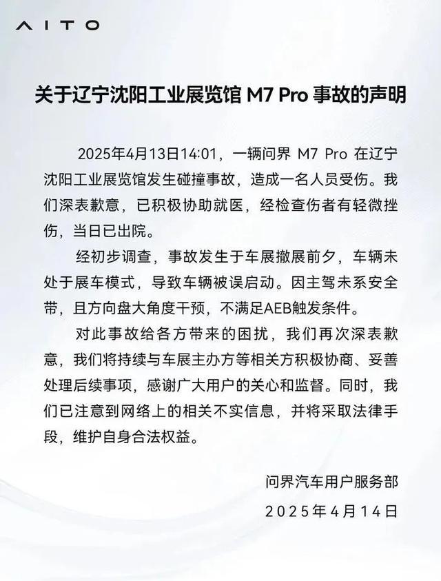 4月14日,问界汽车用户服务部发布声明:“事故发生于车展撤展前夕,车辆未处于展车模式,导致车辆被误启动。因主驾未系安全带,且方向盘大角度干预,不满足AEB(自动紧急刹车系统,属于智能辅助驾驶系统的核心组成部分)触发条件。对此事故给各方带来的困扰,我们再次深表歉意,我们将持续与车展主办方等相关方积极协商、妥善处理后续事项,感谢广大用户的关心和监督。”