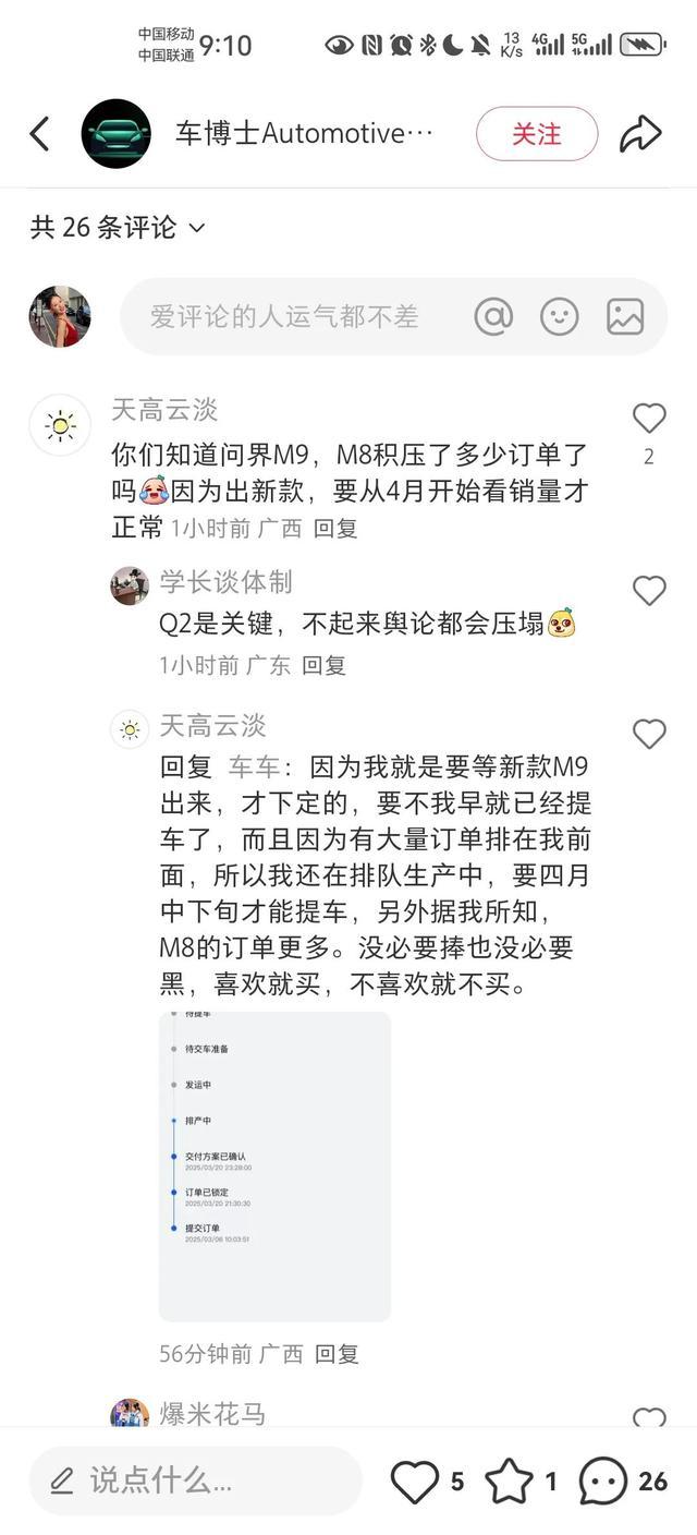 另外,也有网友透露,自己正心心念念地等着最新款 M9。由于问界M9新款发布,导致订单积压,自己因等待新款M9推迟购车计划,目前订单仍在生产队列中,预计四月中下旬才能提车,否则早就提车了。因此,建议大家关注赛力斯4月起的实际销量数据。