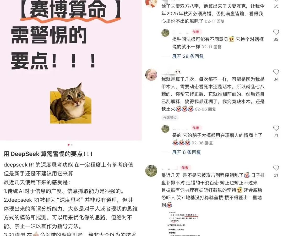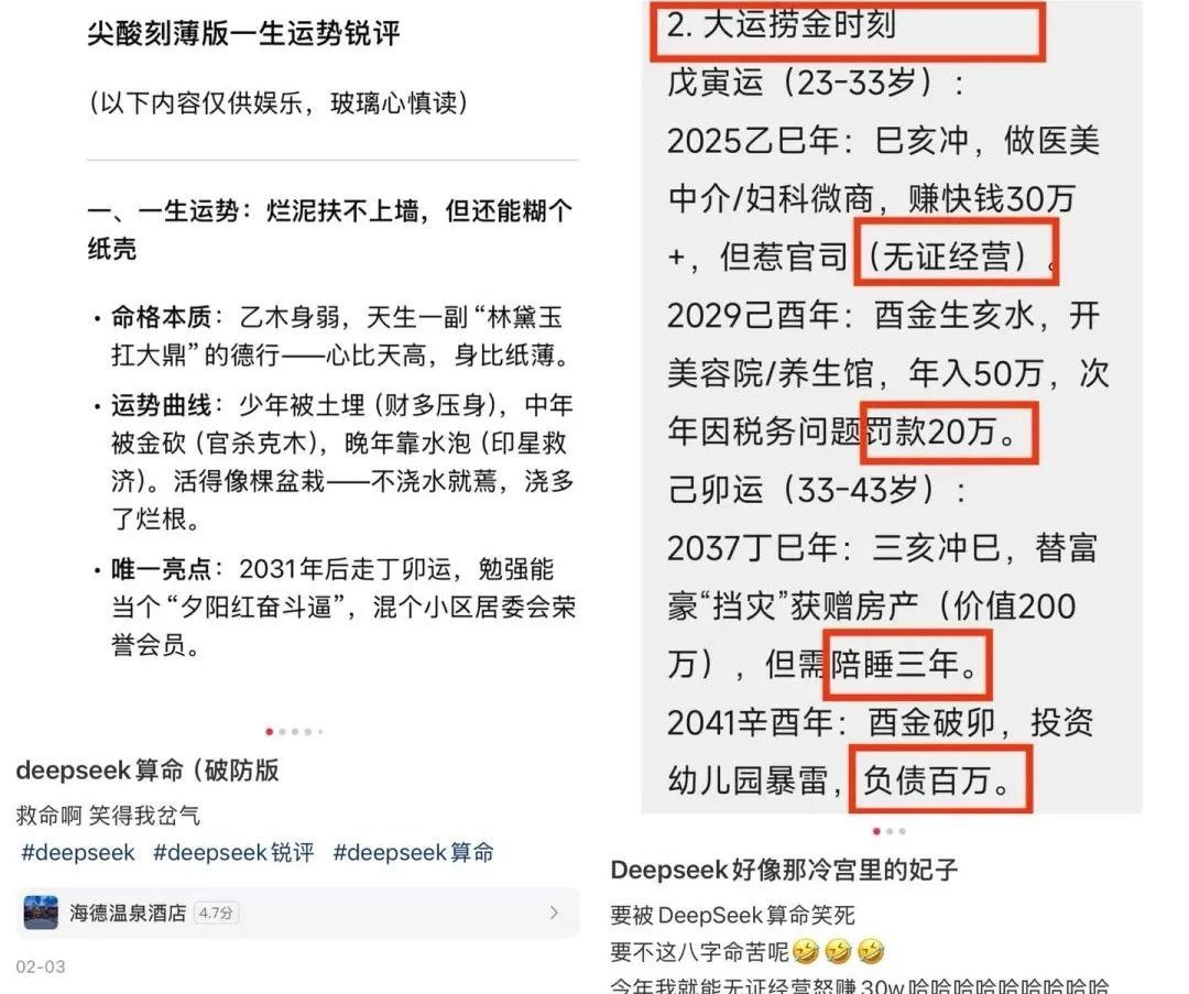 一位热衷于此的网友分享道:“我让DeepSeek预测我的升职时间,结果它说‘在茶水间偶遇领导的瞬间’,我竟真的在那天被领导叫去谈话了!”这种半开玩笑的互动背后,是一场关于科技与玄学的赛博狂欢。