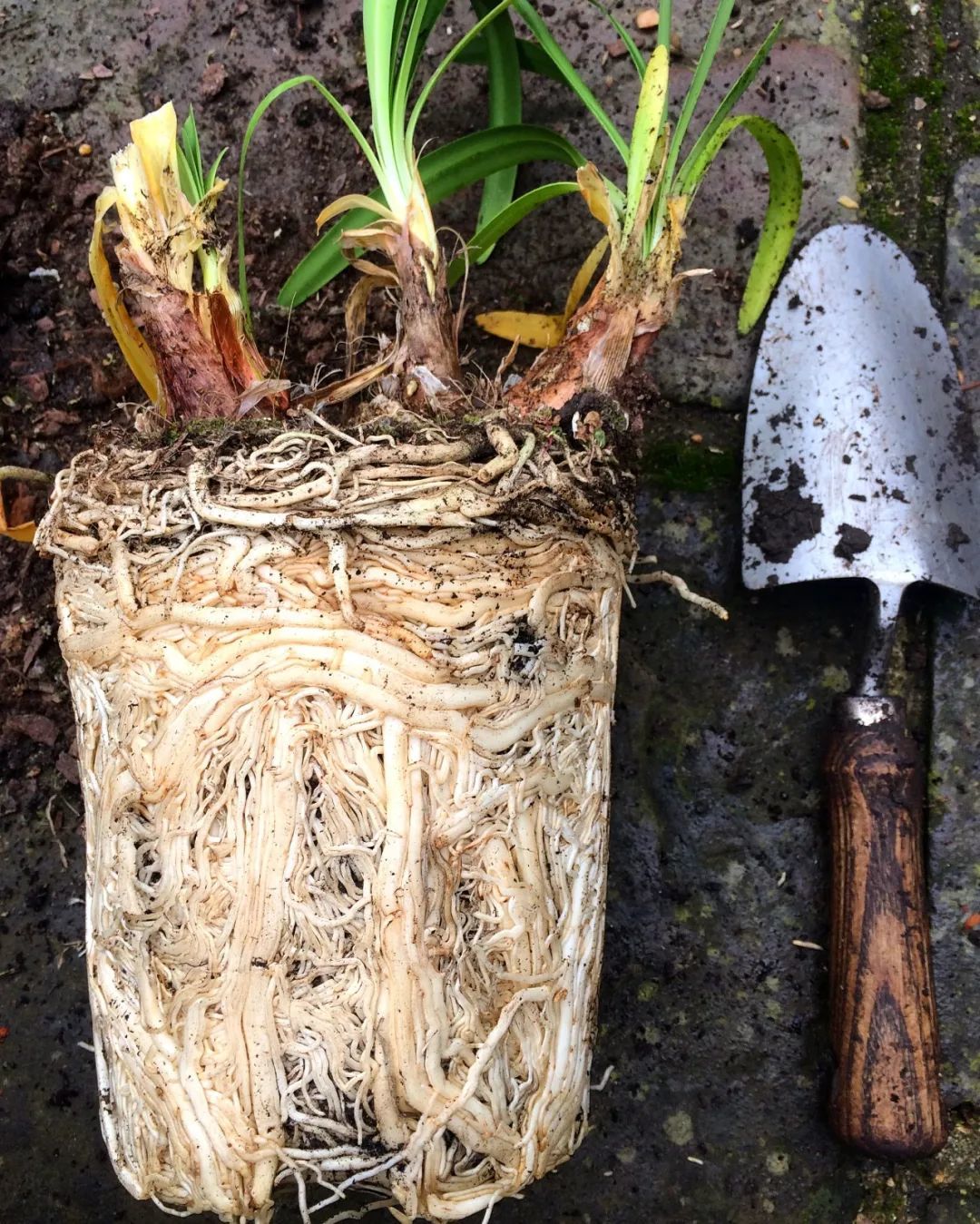 刚买来的盆栽百子莲,就是要先给它的盆土缓慢地浇透水一次,接着就养这一个阴凉通风透光的位置,在早上给两三小时左右的柔和的散射光,过了一两周之后,就可以将花盆倒过来,检查一下整个土团的底部是否有长出一些细小的毛细根,要检查一下盆栽百子莲的根系是否长满盆土,这个时候就可以直接带土换盆了,就比如之前是12厘米直径的花盆,就可以换到一个直径15厘米的容器中。