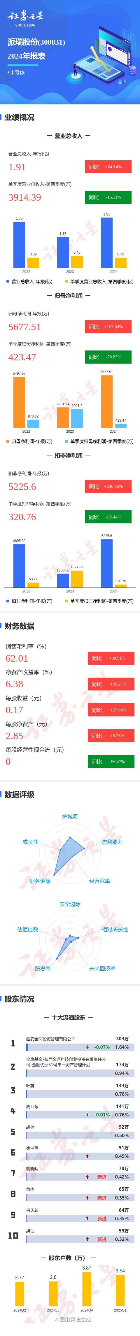证券之星消息,派瑞股份2024年年报显示,公司主营收入1.92亿元,同比上升64.14%;归母净利润5677.52万元,同比上升157.84%;扣非净利润5225.6万元,同比上升248.17%;其中2024年第四季度,公司单季度主营收入3914.39万元,同比下降16.12%;单季度归母净利润423.47万元,同比下降78.84%;单季度扣非净利润320.77万元,同比下降82.45%;负债率7.52%,投资收益158.13万元,财务费用-702.31万元,毛利率62.01%。