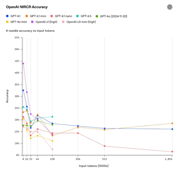 与此同时,GPT-4.1 mini提供了与GPT-4o相当甚至更优的表现,同时降低了延迟并减少了83%的成本。而 GPT-4.1 nano则是OpenAI最快速且经济高效的模型,特别适用于分类、自动完成等需要高效处理的任务。这三款模型共同构成了一个覆盖广泛应用场景的强大工具集。