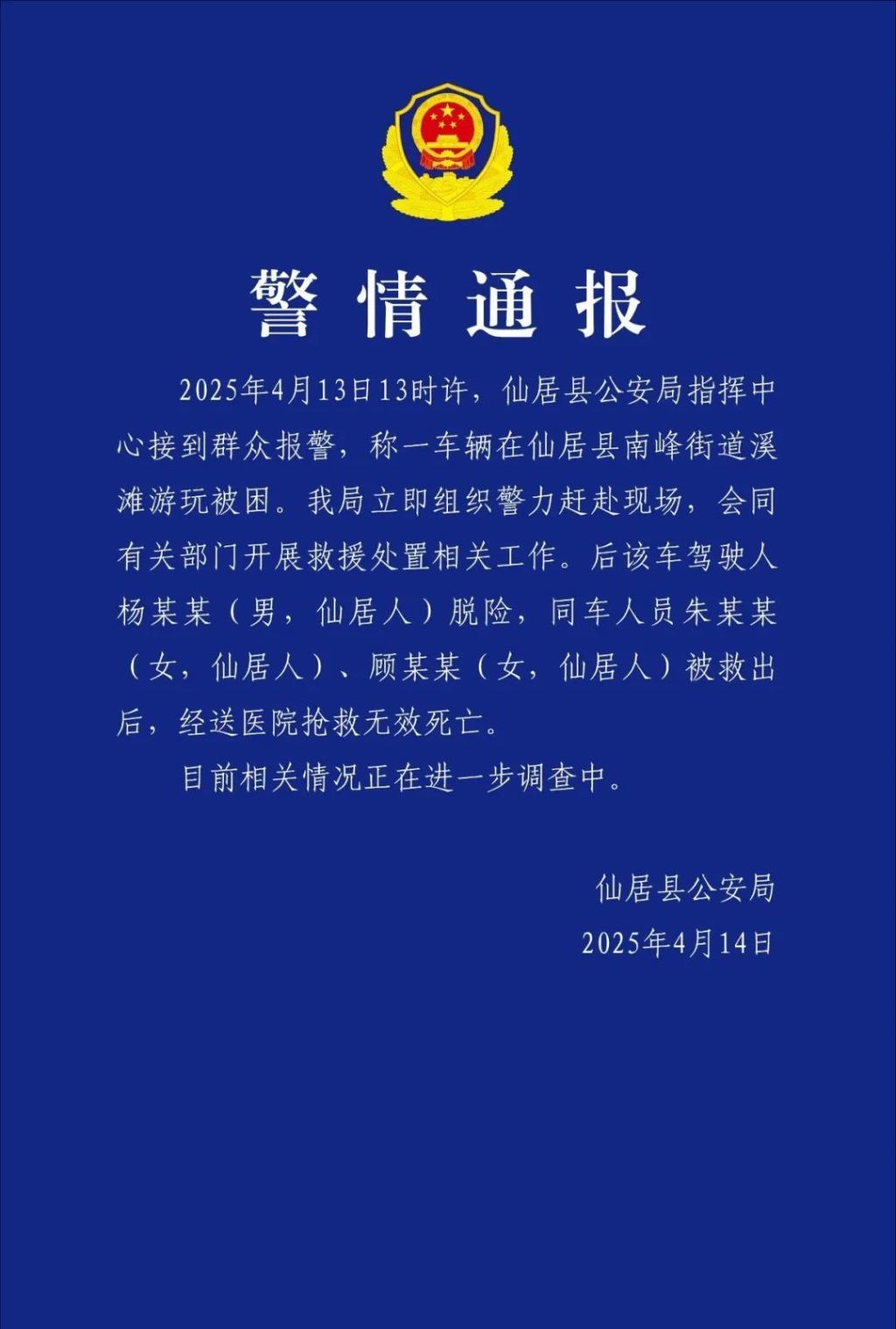 4月14日下午,浙江台州“仙居公安”微信公众号发布警情通报:13日13时许,仙居县公安局指挥中心接到群众报警,称一车辆在仙居县南峰街道溪滩游玩被困。该局立即组织警力赶赴现场,会同有关部门开展救援处置相关工作。后该车驾驶人杨某某(男,仙居人)脱险,同车人员朱某某(女,仙居人)、顾某某(女,仙居人)被救出后,经送医院抢救无效死亡。