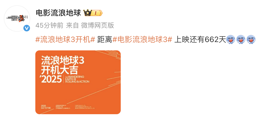 4月15日,@电影流浪地球 宣布《流浪地球3》开机,并表示距离上映还有662天。郭帆导演,吴京、沈腾等主演参加开机仪式。