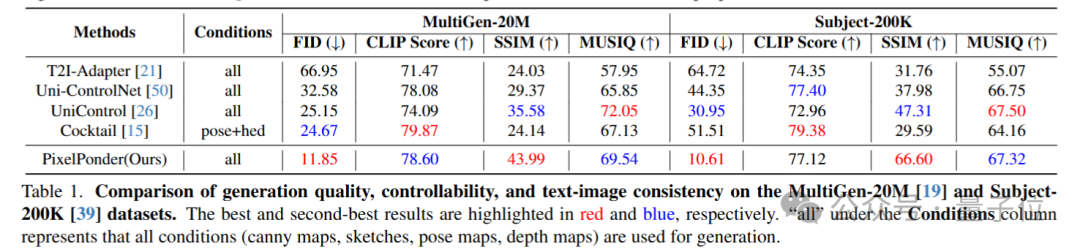 实验显示,在两类不同主题的测试集上,大量的数据(约1w张)结果表明PixelPonder相较于单视觉控制和多视觉控制方案,在视觉和谐度和可控度上有了极大的提升。