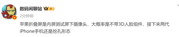 此外,该博主还表示,虽然苹果在折叠屏上测试屏下镜头技术,但是这并不会立刻用在普通版的iPhone上,接下来两代iPhone手机还将是挖孔形态,依旧保留灵动岛。