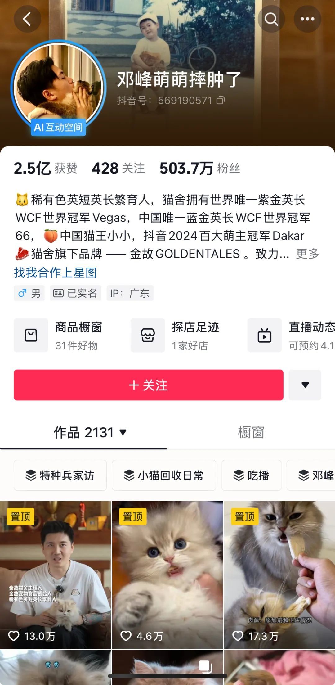 经过几年的运营,住大别墅、顿顿吃肉的品种猫,以及猫舍主理人邓峰“花臂猛男”和夹子音的反差人设,成为 @邓峰萌萌摔肿了 流量密码,全网吸粉超千万,在抖音有 503.7 万粉丝,是萌宠领域的顶流博主。