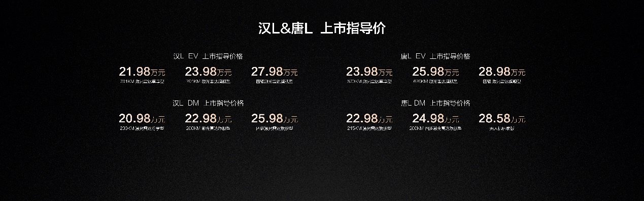 比亚迪划时代旗舰汉L唐L已正式上市,推出汉L EV、汉L DM、唐L EV、唐L DM四大车系,并分别推出6大配置版本,售价为20.98万~28.98万元,强力冲击中高端市场。